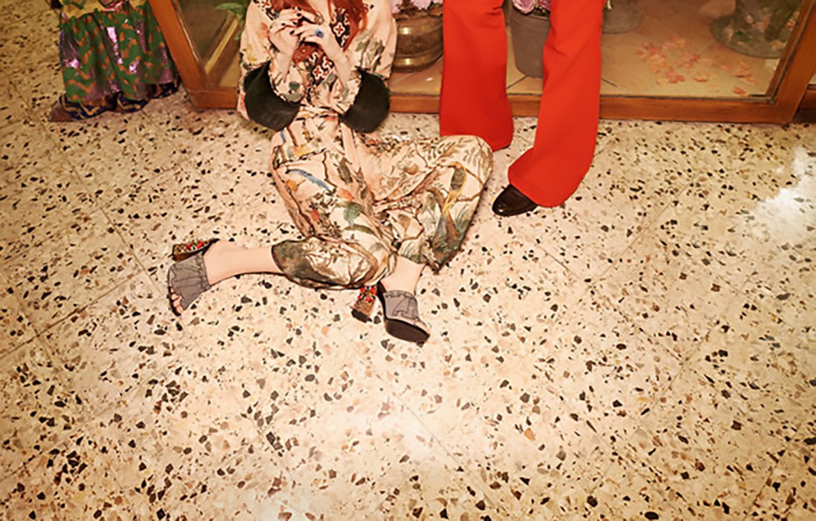 Ambienti dai colori pop e glamour che si intonano alla perfezione con gli abiti disegnati da Alessandro Michele, ma è il mood che trasporta dall’immagine all’immaginario.
